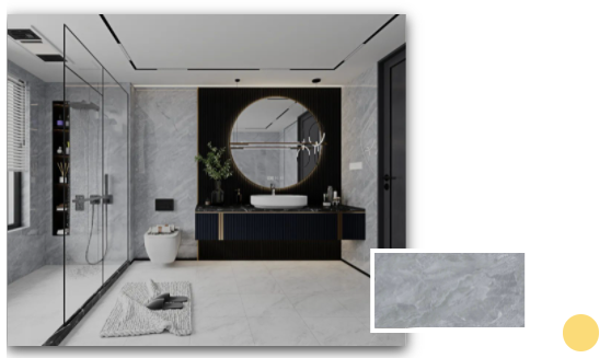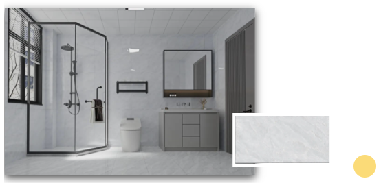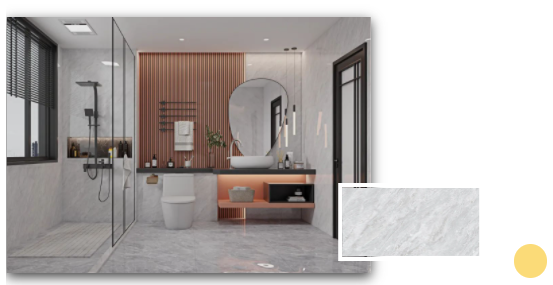 安道爾橙格柵背景+水云灰通體瓷拋石中板的溫暖搭配,令一個舒適的浴室環(huán)境躍然而上。扇形的鏡面設(shè)計配以及暖色調(diào)條形燈,不僅契合當(dāng)下年輕人的空間審美,更煥發(fā)出不一樣的青春活力。